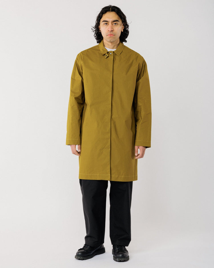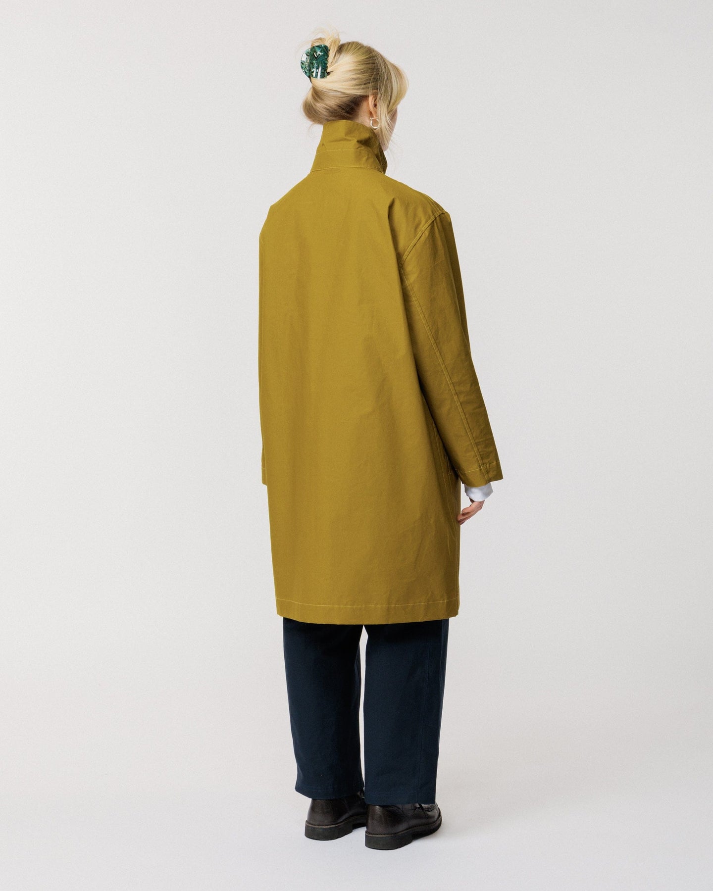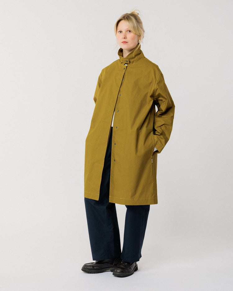 Crafted from organic Bio Nova waxed cotton by Halley Stevensons - specialists in weatherproof textiles since 1864 - this premium fabric features a bio-based, fluorocarbon-free (FCF) coating. The result is a breathable, lightweight mac with a subtle technical feel that keeps you dry in a shower without the bulk of a traditional waxed jacket.