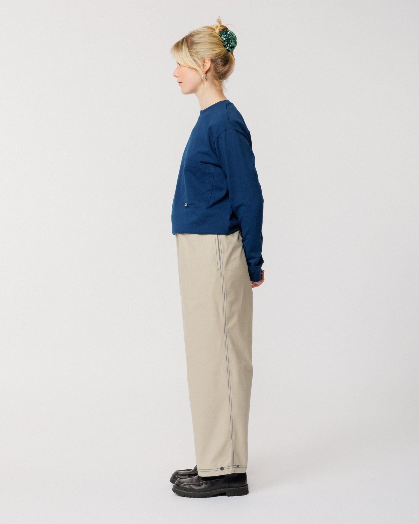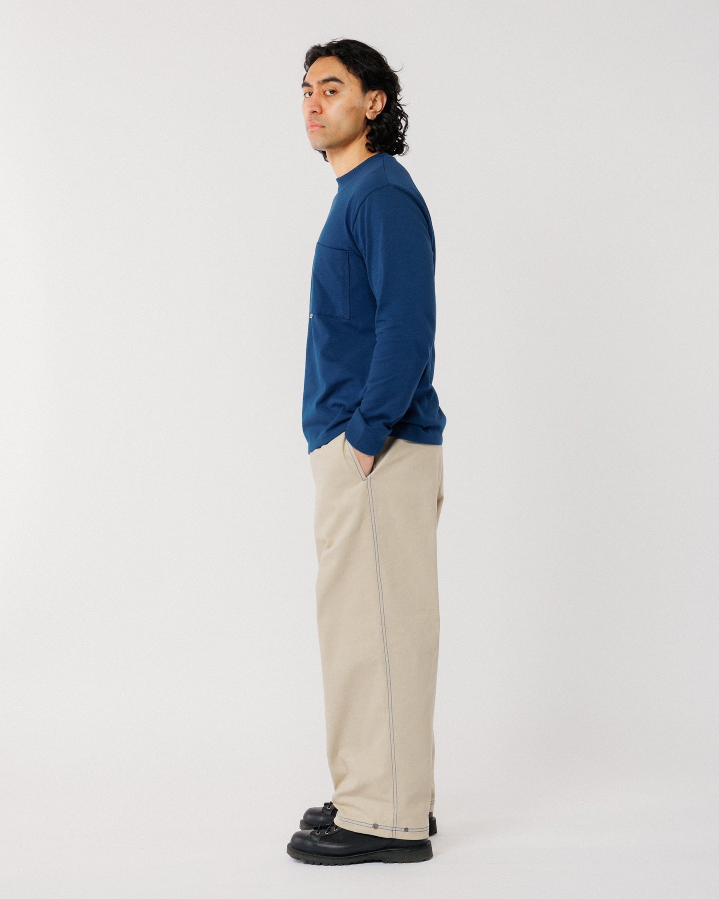 Our best-selling Zama Pants return with a subtle twist - refreshed in a contemporary stone canvas with cobalt blue contrast stitching that adds a standout edge to this everyday essential. Same signature fit, same durability, now with detailing that makes them pop.