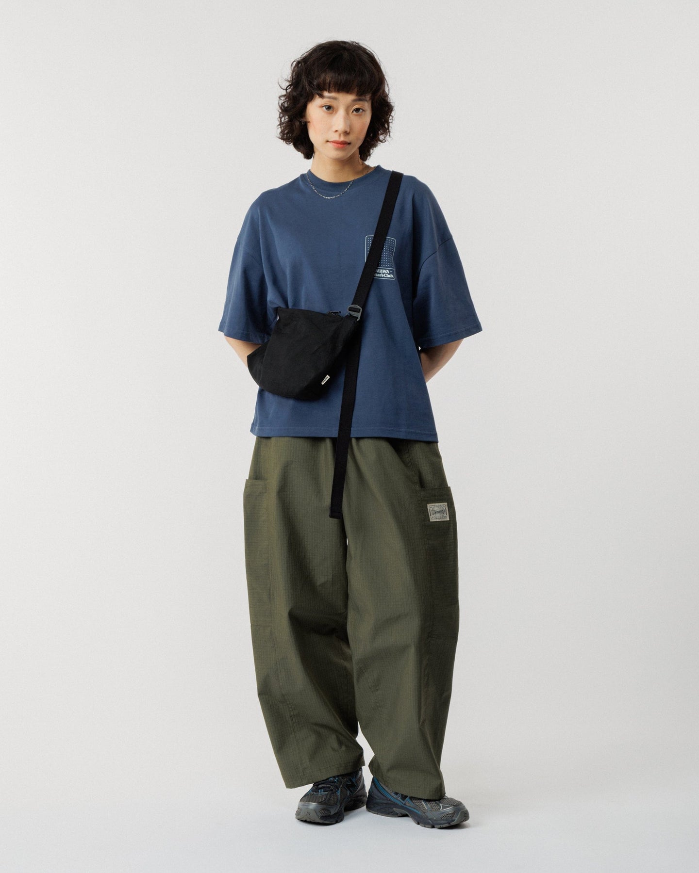 A recycled zip fastening secures the main compartment, while an adjustable cotton webbing strap and metal G-hooks provide comfort and adaptability on the move.