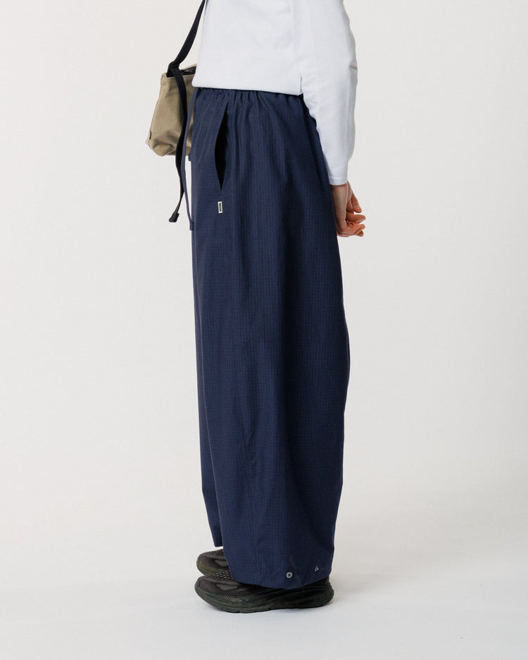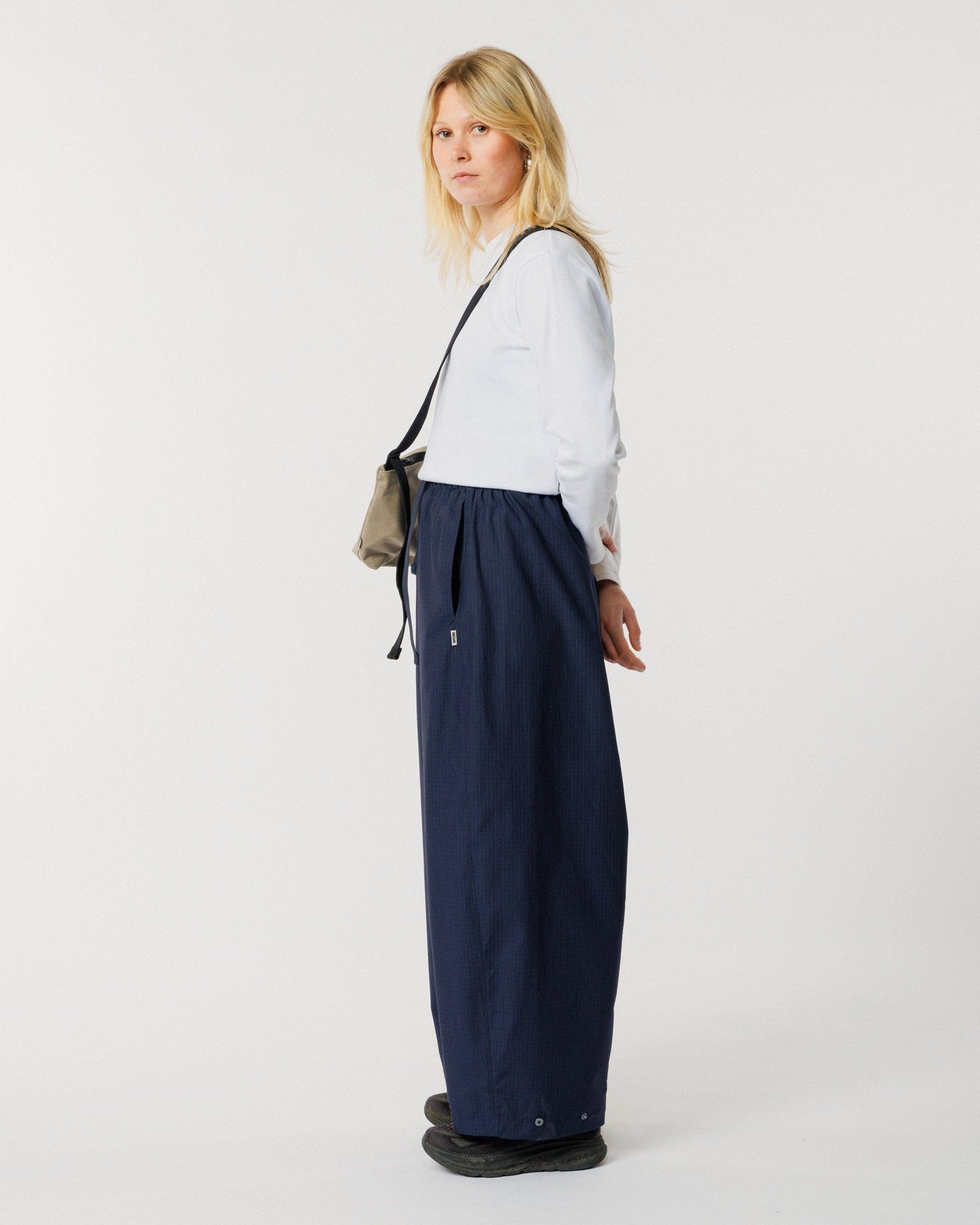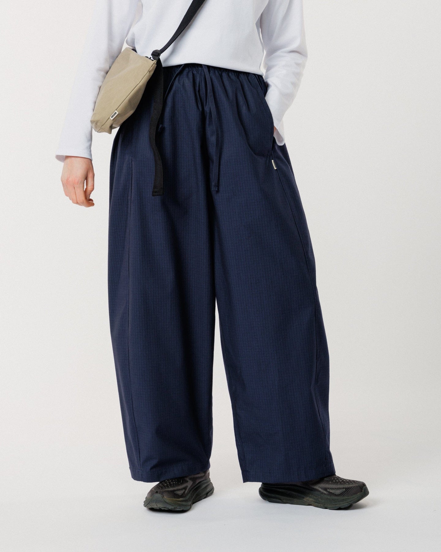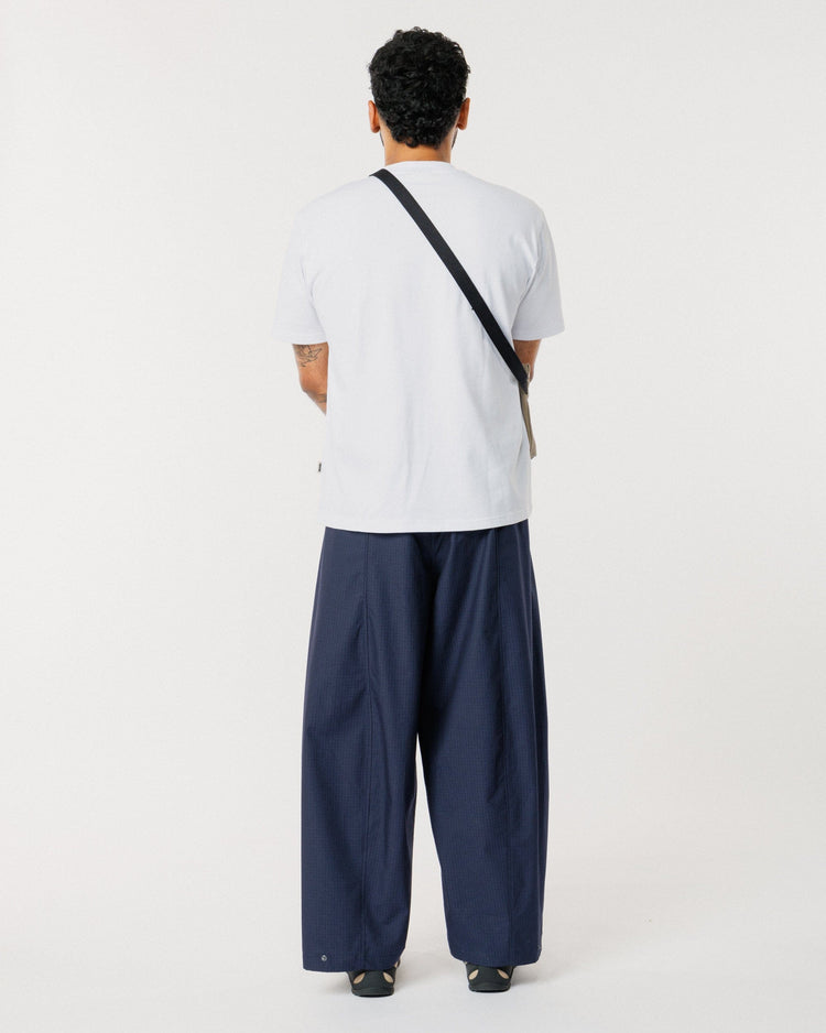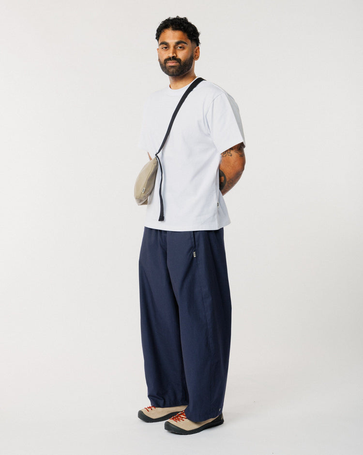 The silhouette is defined by off-centre seam detailing that gently sculpts the voluminous barrel leg while maintaining a clean, contemporary profile. An elasticated waistband with drawstrings delivers all-day comfort and an adjustable fit, sitting naturally on the body without restriction. Deep side pockets are cut to hold essentials, while an integrated key loop adds everyday practicality.