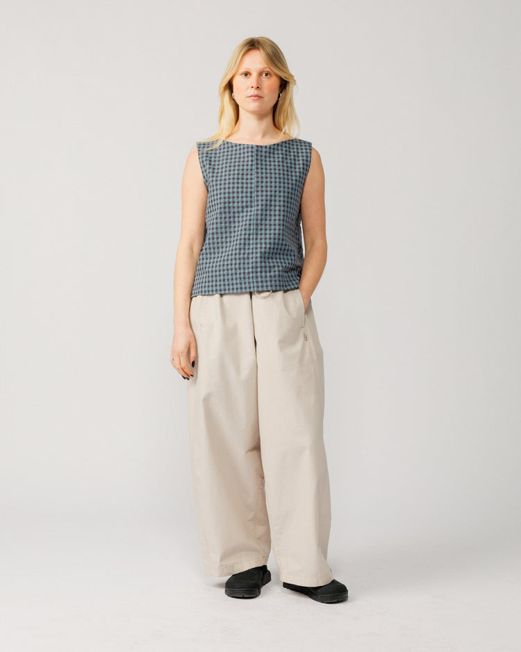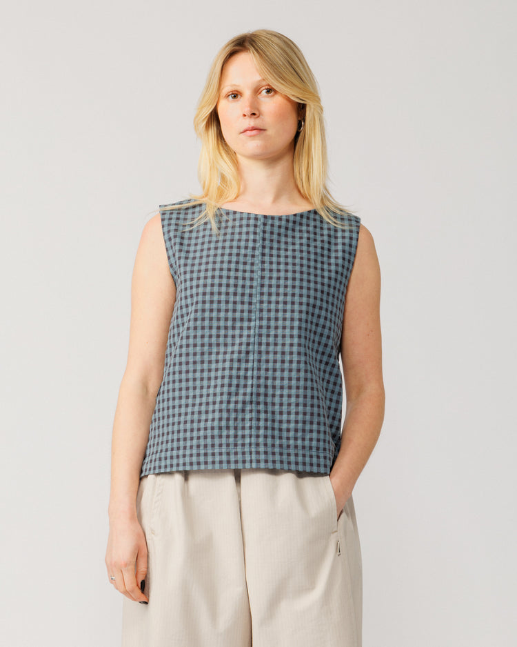 Your new warm-weather staple. The Aimee Top V2 in a lightweight navy checked fabric - effortless and easy to style. Improved where it counts; a better fit around the chest and neck, and a flattering wide boat neckline.