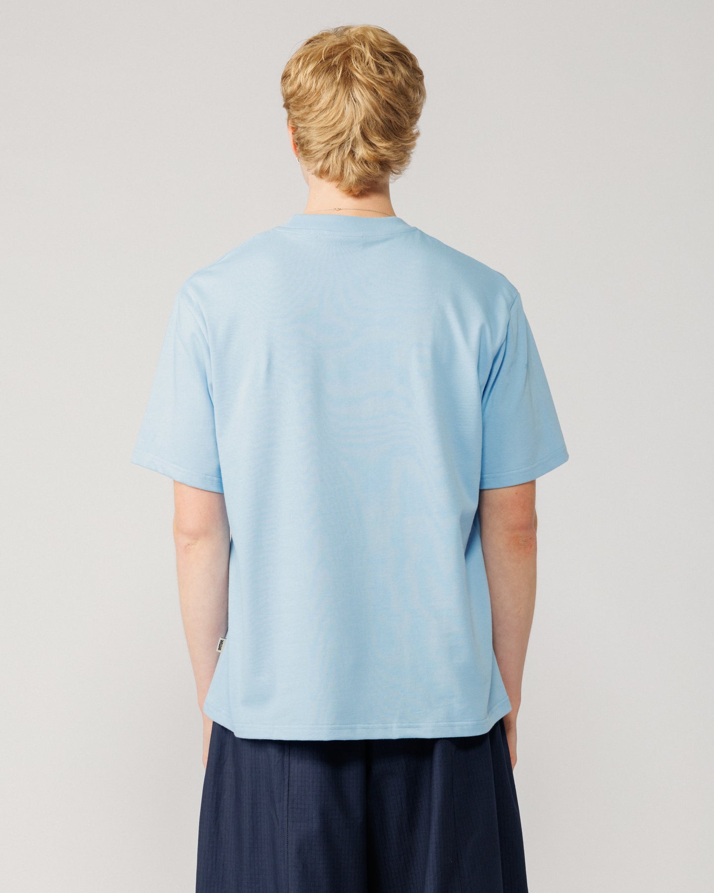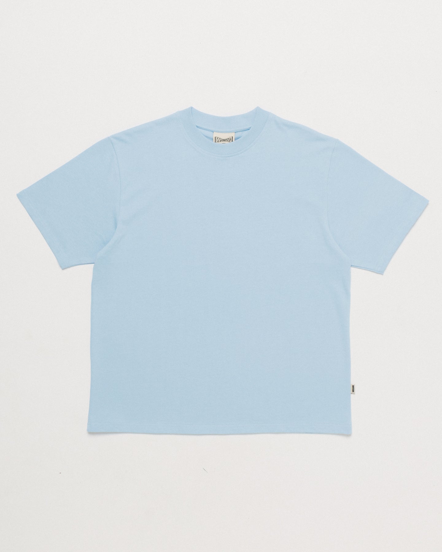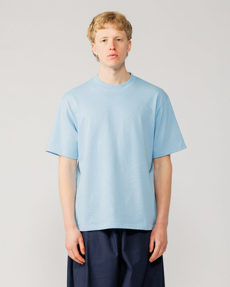 The Mid-Weight Organic T-Shirt in sky blue is part of our first UK-made jersey collection. Cut from a soft 230gsm organic cotton jersey with a relaxed fit and very slight crop. Pre-shrunk and ready for regular washing, it holds its shape and softens with wear. Finished with a subtle logo in the side seam and a custom artwork size label.