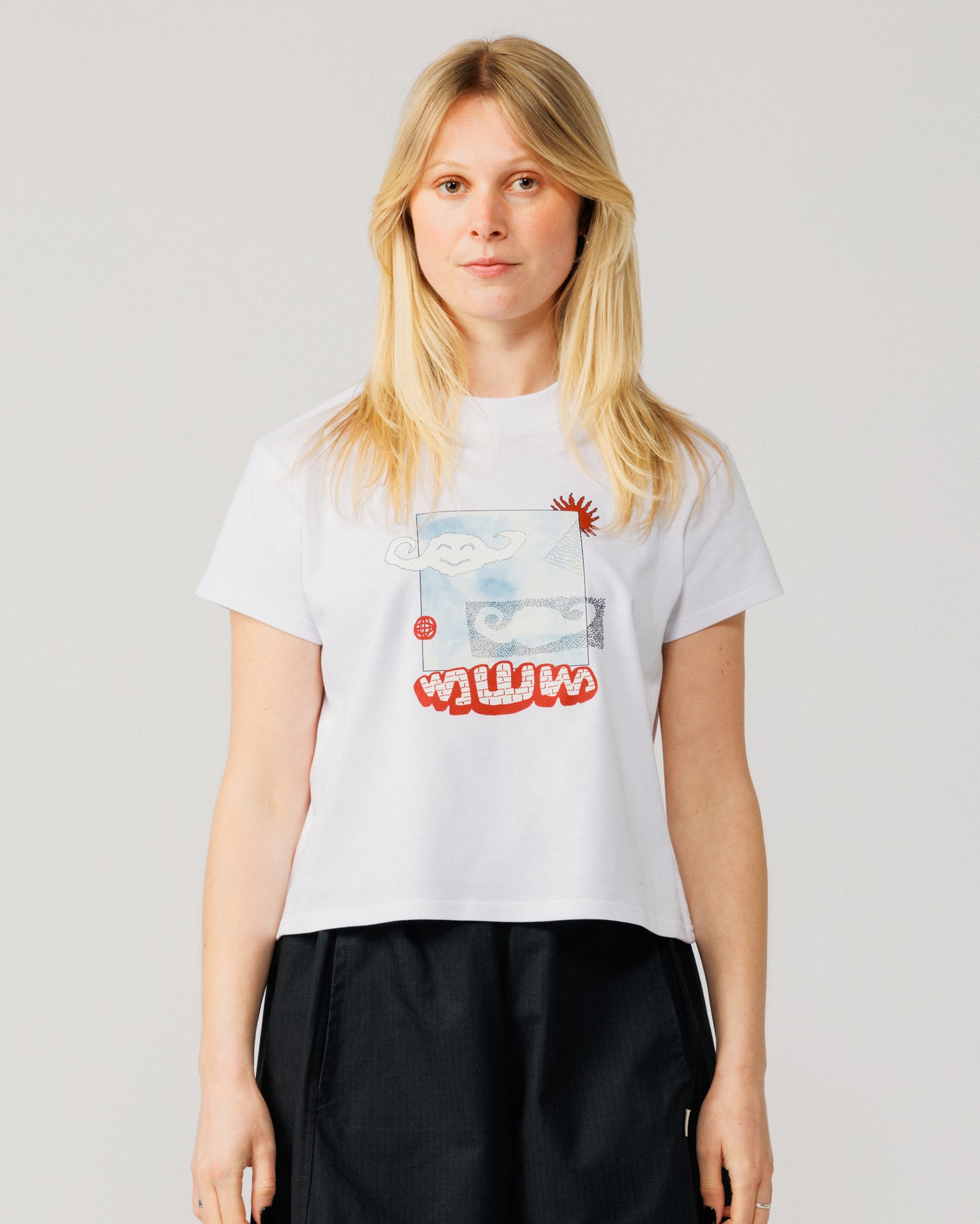 Our first UK-made cropped t-shirt, now with a graphic worth talking about. Playful, hand-drawn artwork designed and printed in our Manchester workshop on soft 230gsm organic cotton jersey.