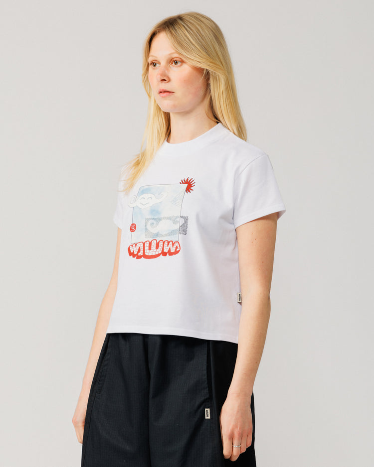 The Plume Cropped T-Shirt in white is pre-shrunk and ready for regular washing, it holds its shape and softens with wear. Finished with a custom artwork size label.