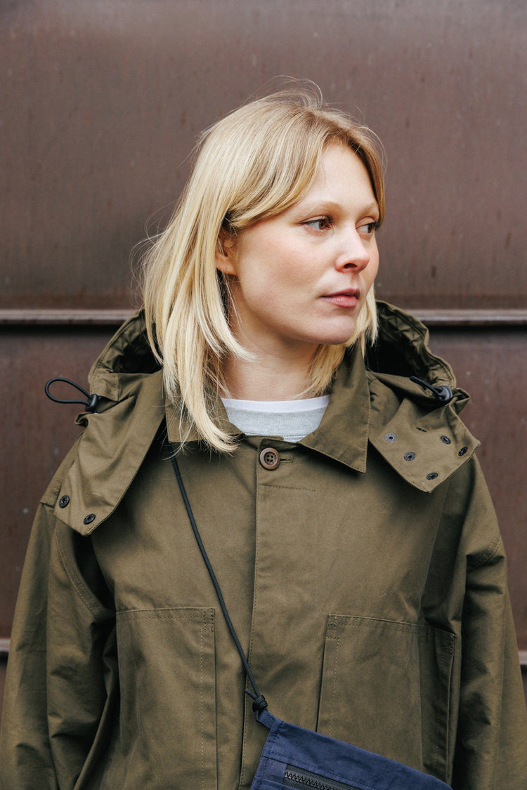 Our Khaki Detachable Hood brings military-inspired sophistication to modern outerwear. The perfect complement to your Nell Jacket, our detachable hood combines functionality with sophisticated design. Crafted from the same premium Scottish dry-waxed cotton as the jacket, it ensures consistent protection and style. The innovative tyre panel design and double-layered construction offer superior coverage, while multiple adjustment points allow for a customized fit around your face. Attaches seamlessly to your Nell Jacket with discrete poppers.