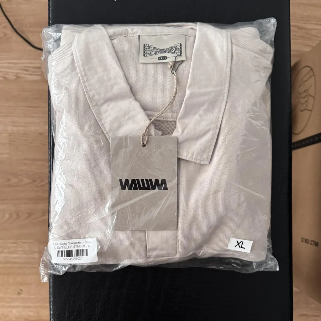 The Ellis Rugby features a relaxed, boxy silhouette. We recommend ordering your usual size, or consider sizing down if you prefer a more fitted look.