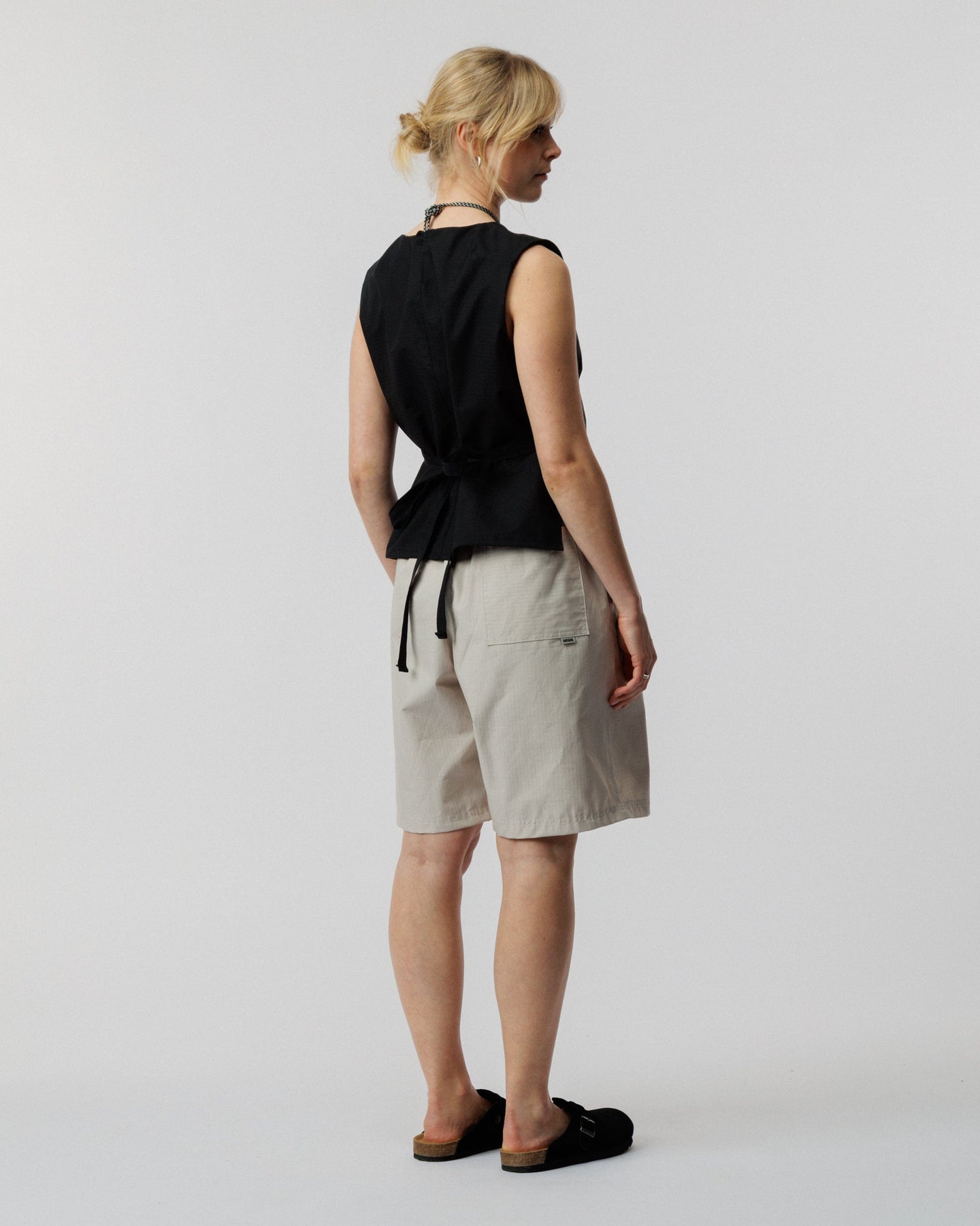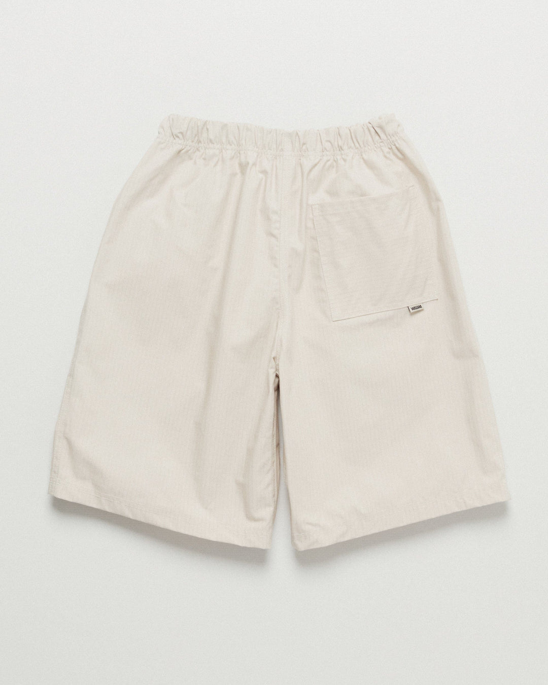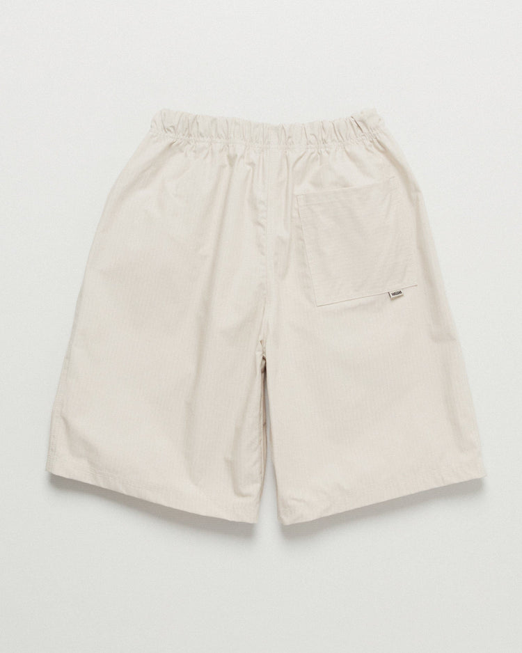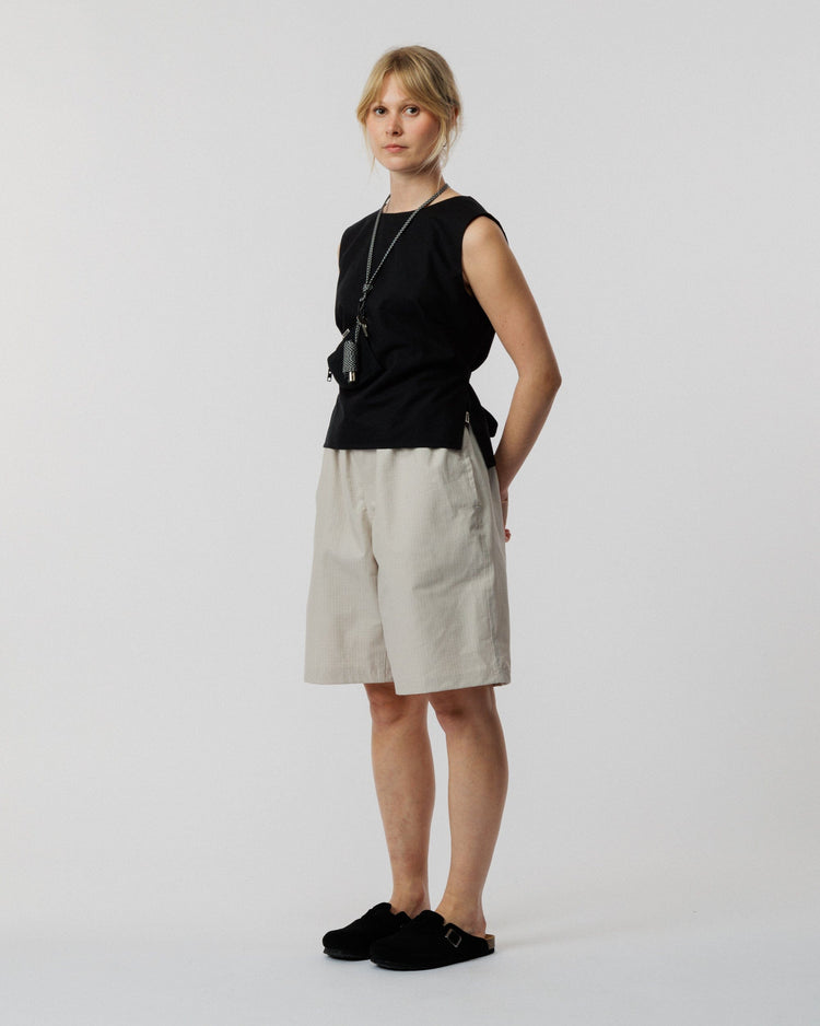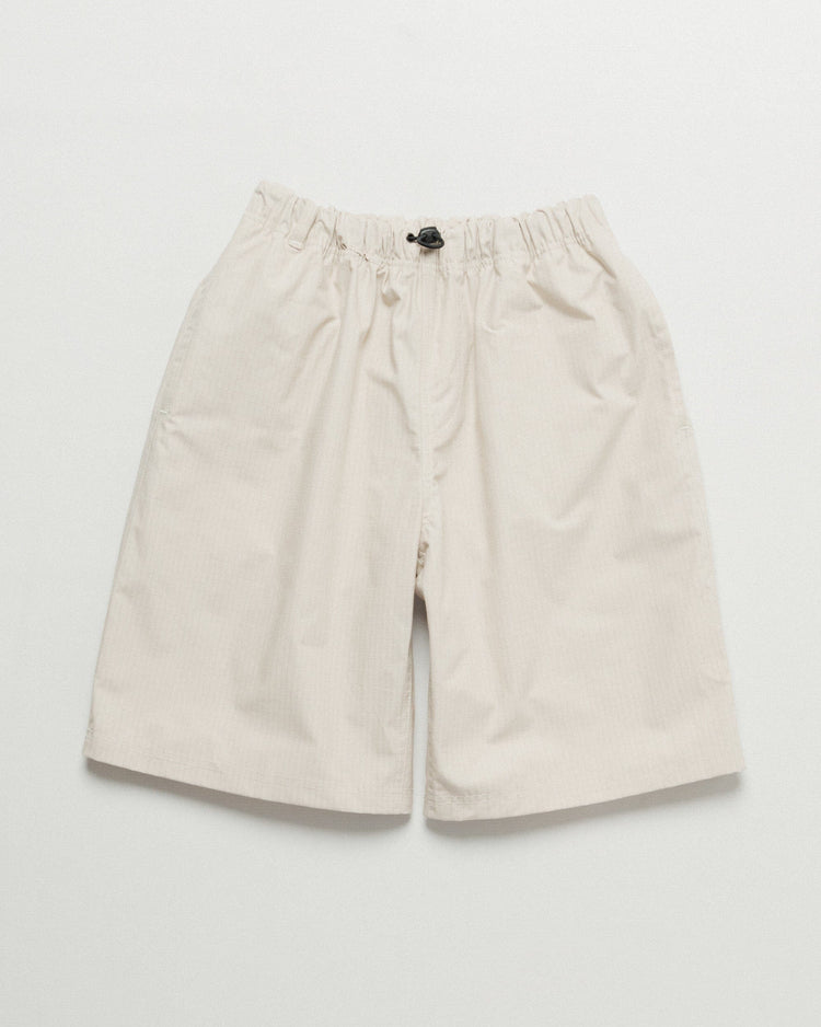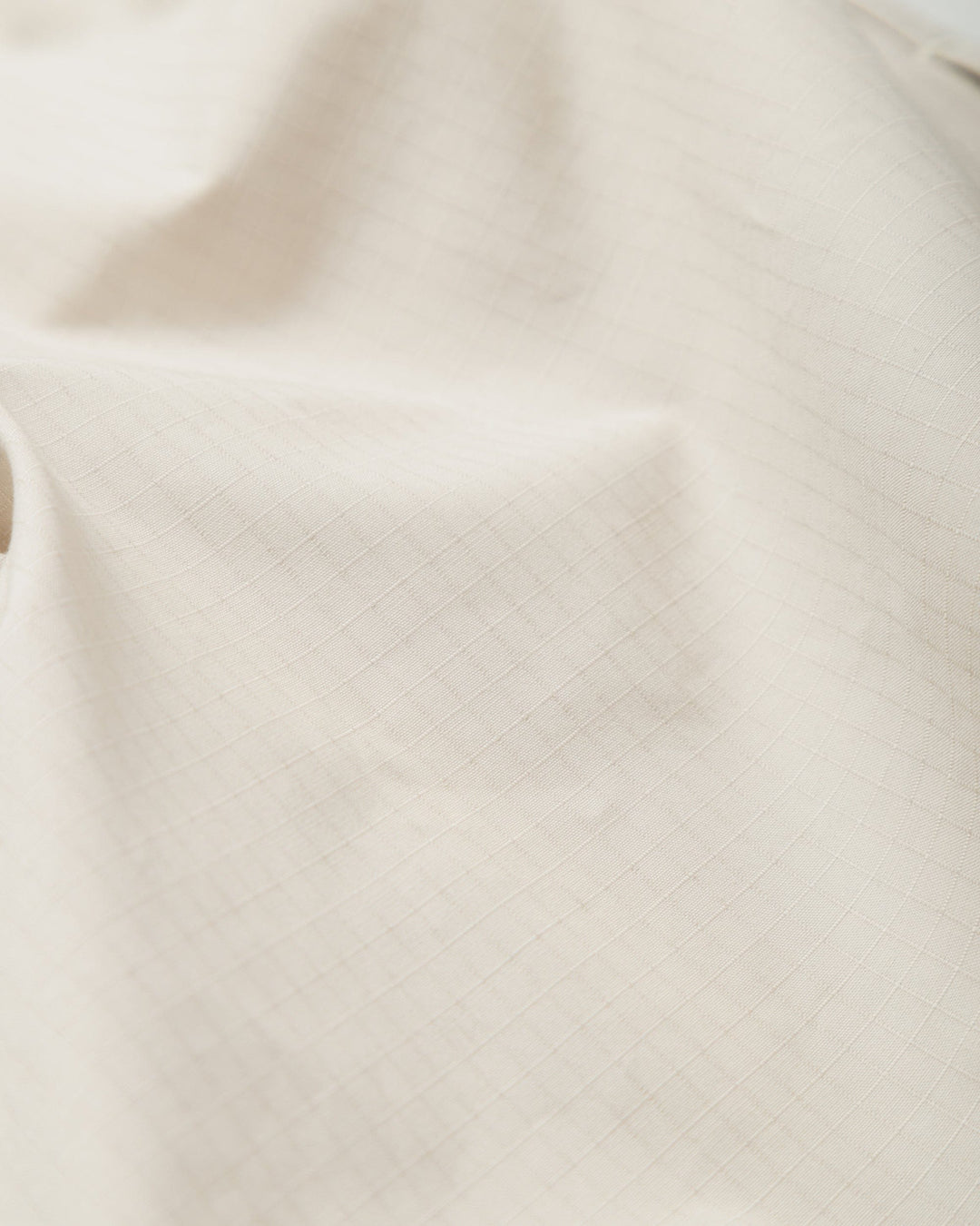 Crafted from lightweight organic ripstop cotton, the Ripstop Zama Shorts in stone embody the ultimate workwear fabric philosophy. The innovative grid structure means if they ever tear during your explorations, rips will only travel in straight lines—making repairs simple and extending their lifespan.