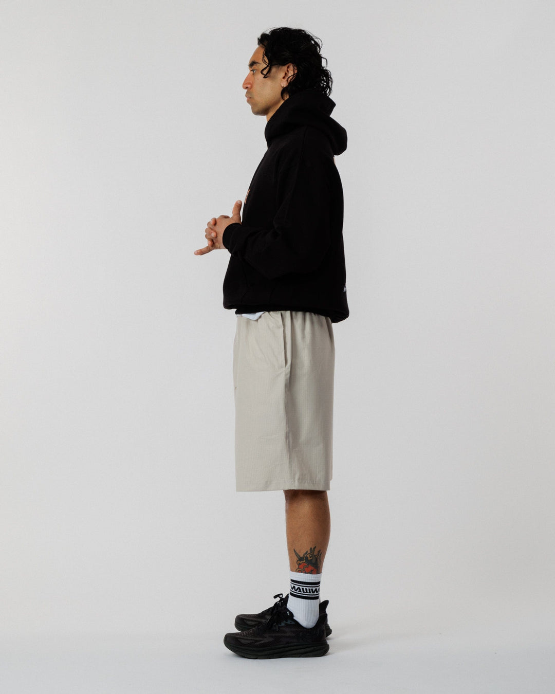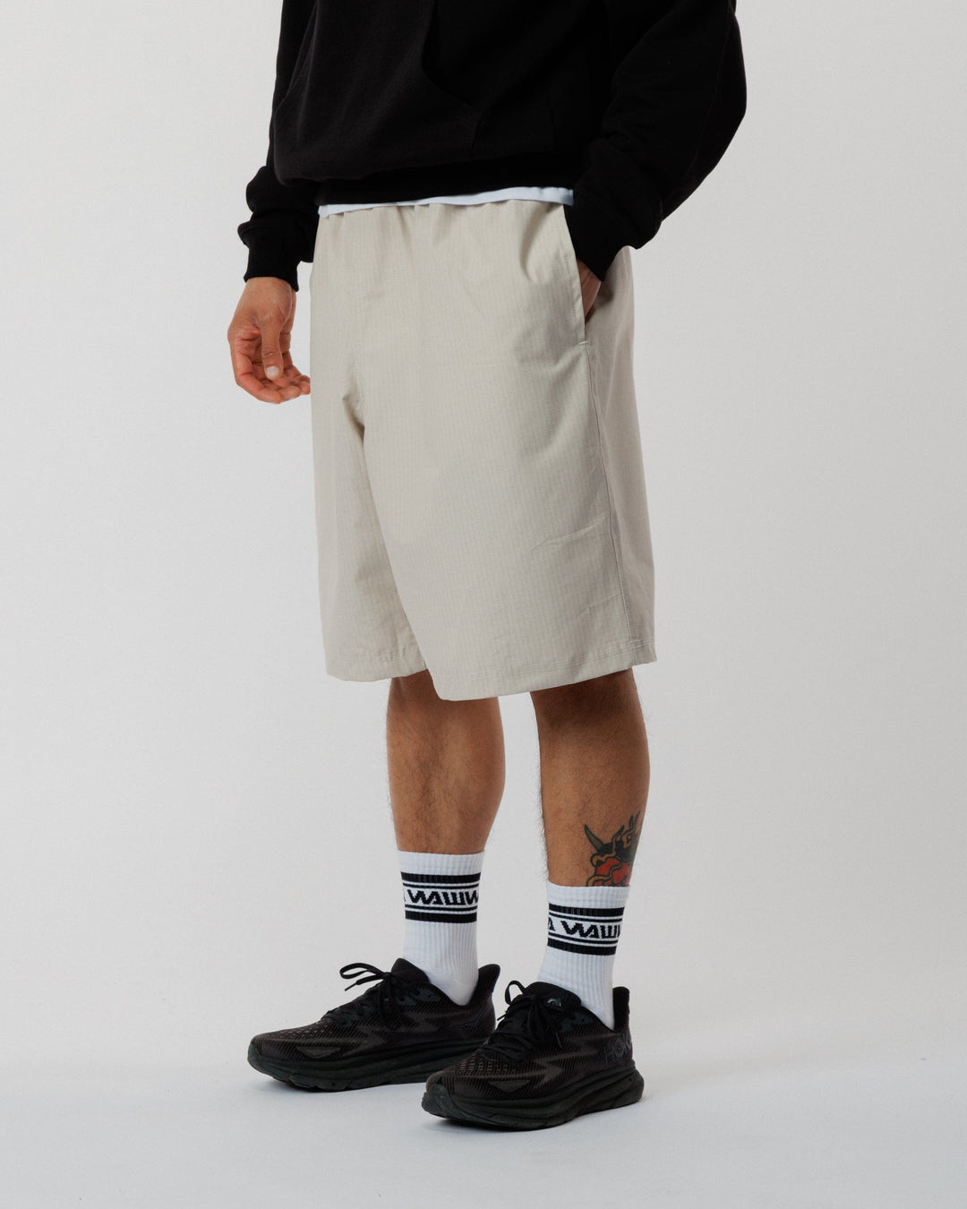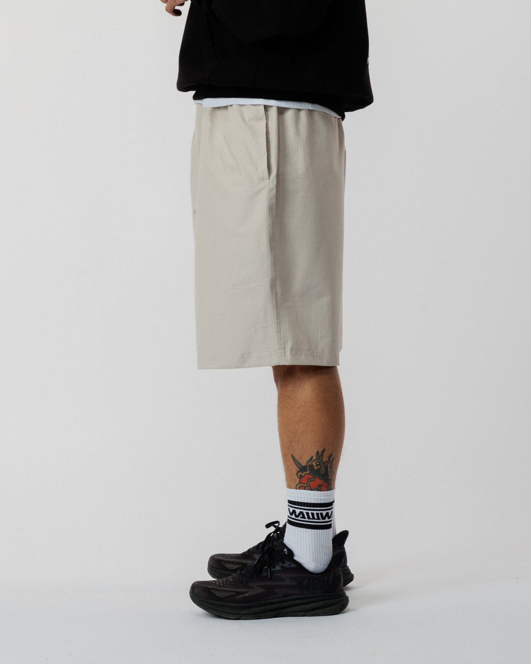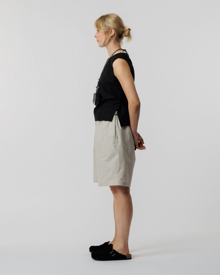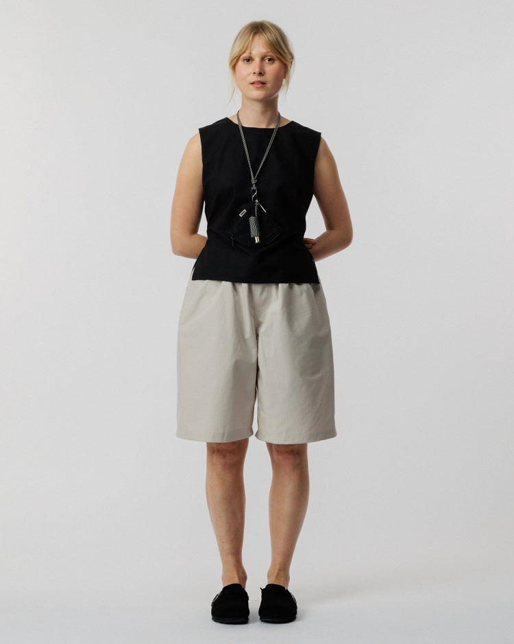 Crafted from lightweight organic ripstop cotton, the Ripstop Zama Shorts in stone embody the ultimate workwear fabric philosophy. The innovative grid structure means if they ever tear during your explorations, rips will only travel in straight lines—making repairs simple and extending their lifespan.